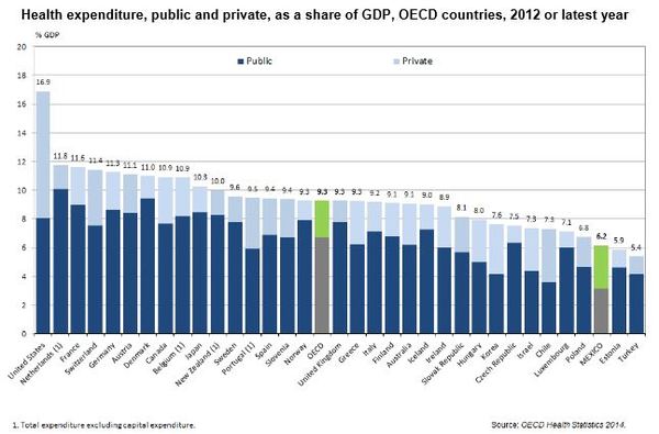 Total health spending accounted for 6.2% of GDP in Mexico in 2012, among the lowest shares of OECD countries (only Estonia and Turkey spend less) and well below the OECD average of 9.3%.